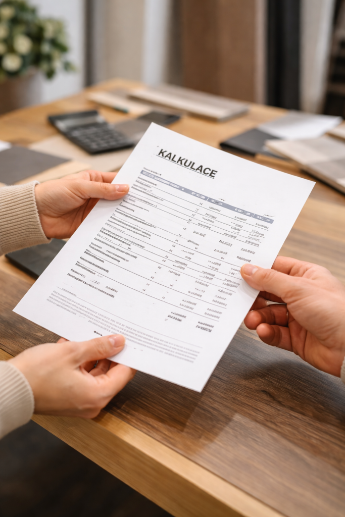 Prvotní koncept současně obsahuje orientační cenovou kalkulaci, která zahrnuje jak cenu navržených materiálů, tak předběžný odhad nákladů na realizaci.